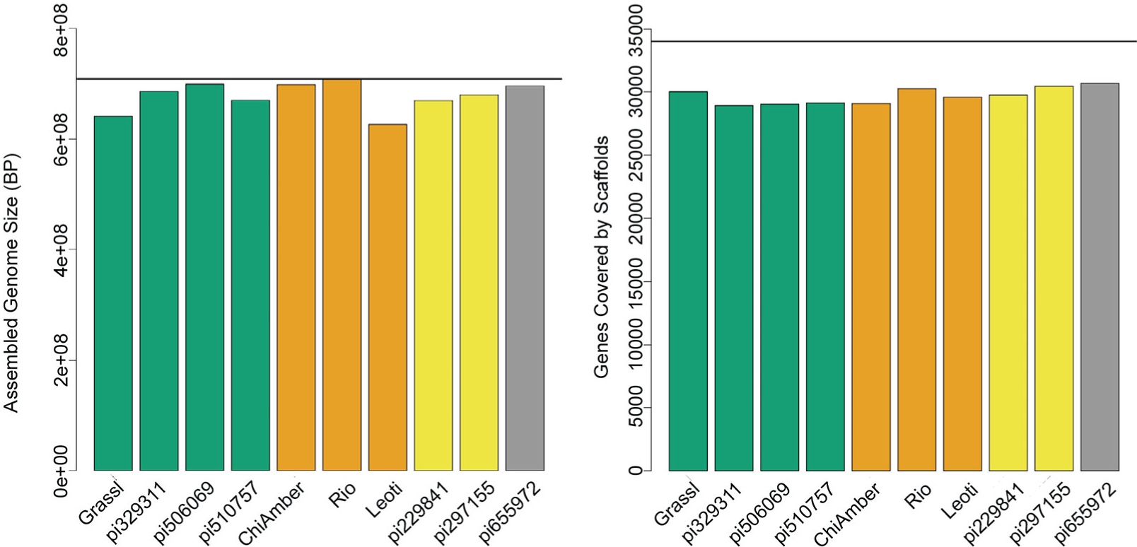 This study highlights the importance of the non-core genome and the utility of the pan-transcriptome in sorghum. Differential expression analysis using the pan-transcriptome revealed 209 genes that responded differently to iron stress in the sweet and non-sweet types, which was more than twice as many genes found using only a single reference genome.
